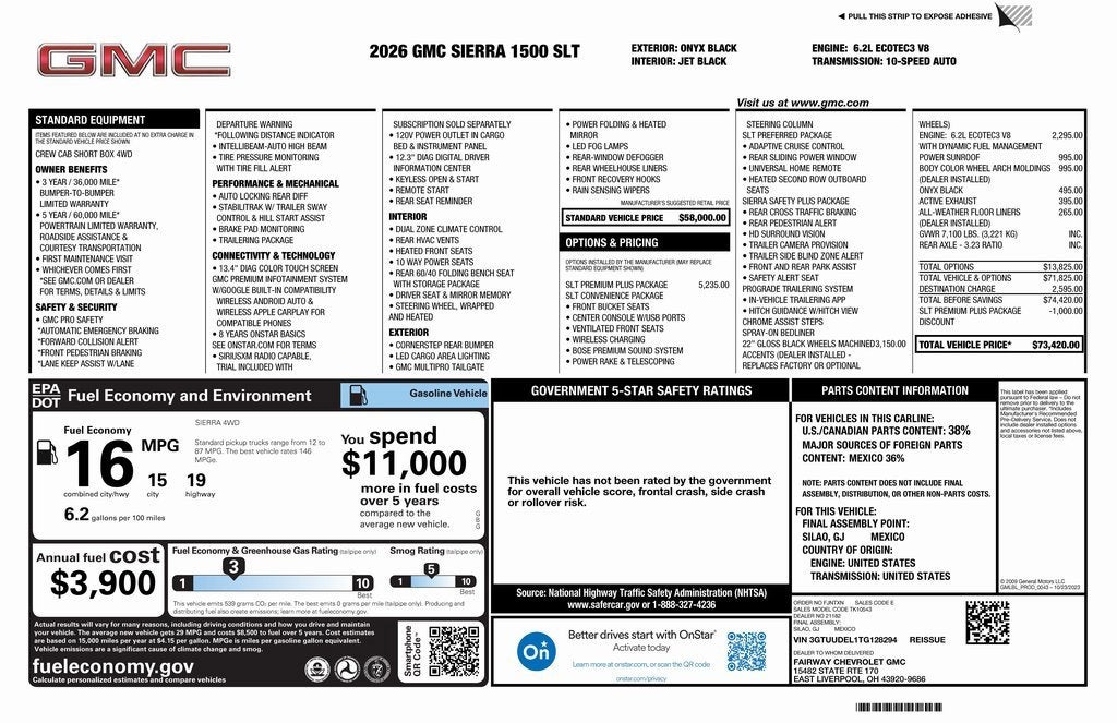 2026 GMC Sierra 1500 SLT 4D Crew Cab Onyx Black EcoTec3 6.2L V8 10-Speed Automatic