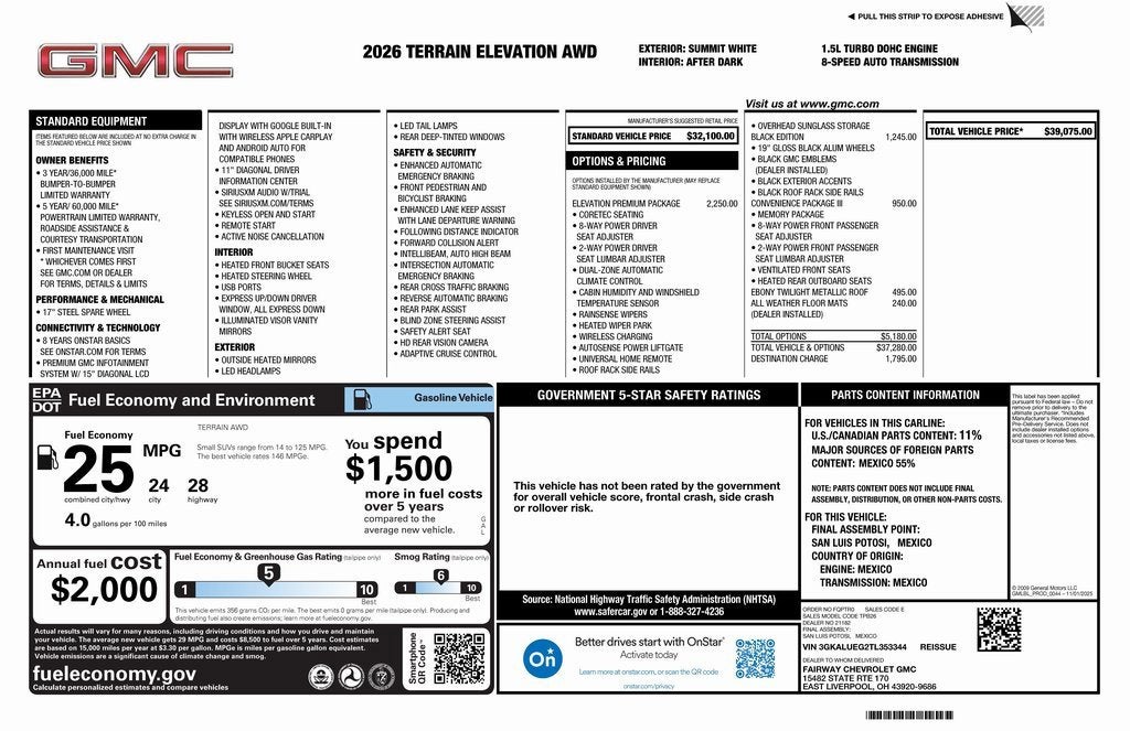 2026 GMC Terrain Elevation 4D Sport Utility Summit White 1.5L DOHC 8-Speed Automatic with Overdrive